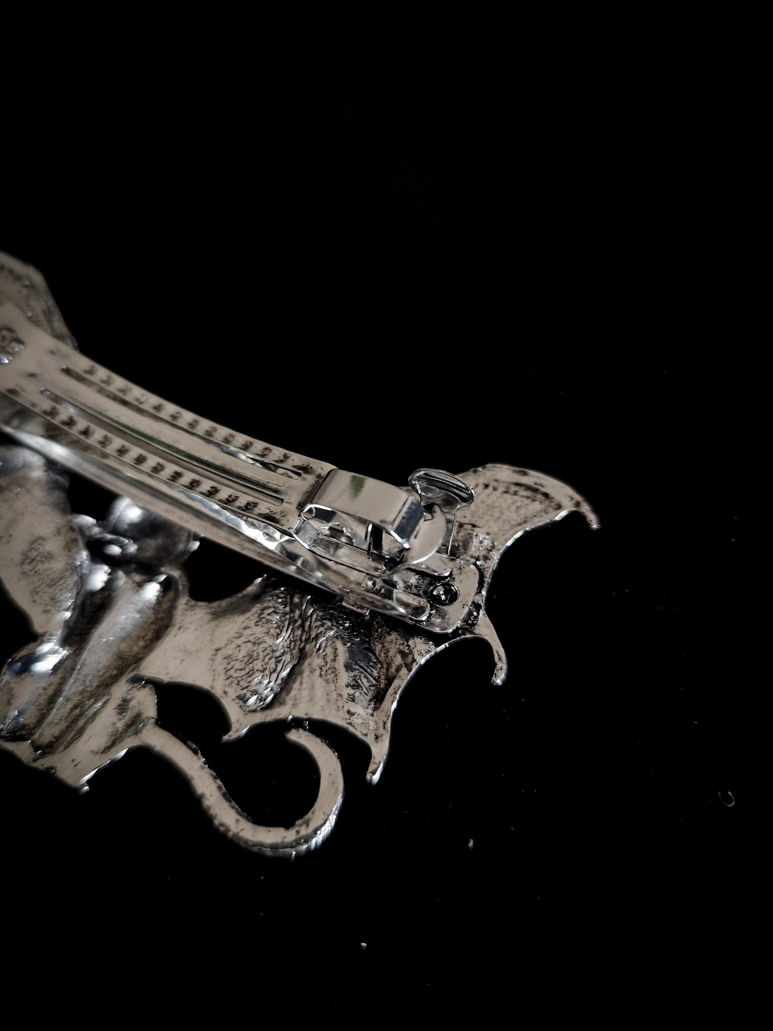 Add a touch of dark fantasy to your look with this intricately crafted metal hair clip featuring a mystical cat with wide, textured bat wings. Designed for lovers of gothic, alternative, and fantasy aesthetics, this statement piece is both sturdy and visually striking. Perfect for securing sections of hair or elevating any hairstyle with a dramatic, otherworldly flair.