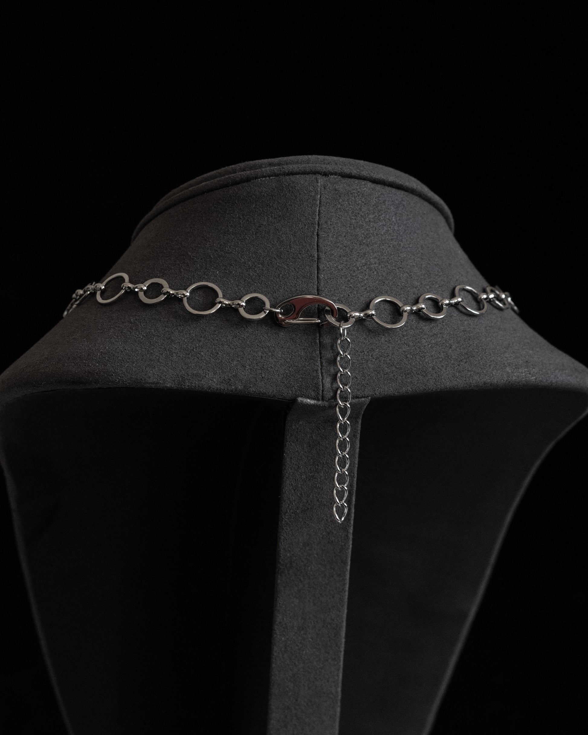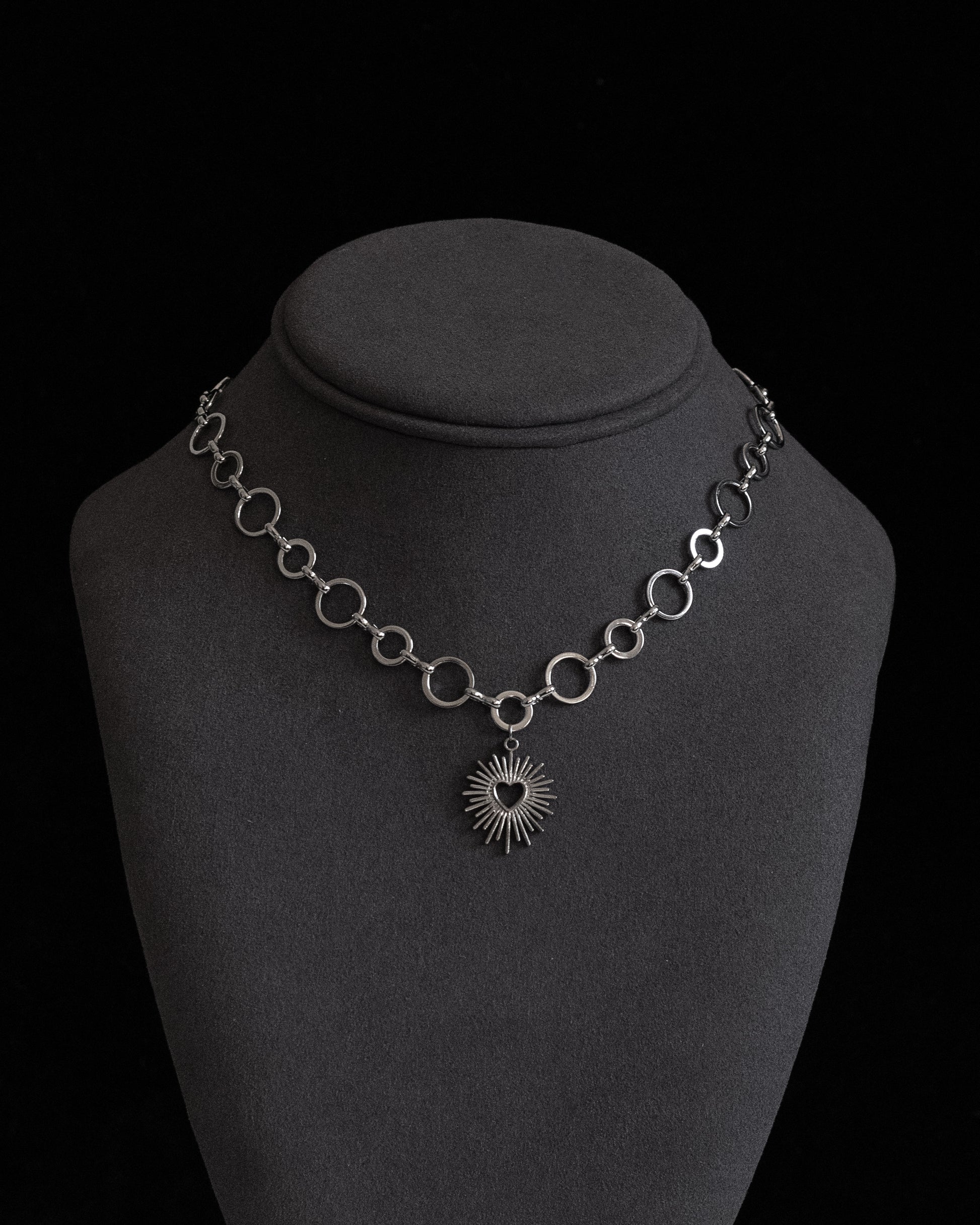 Handmade stainless steel necklace featuring a sequence of sleek interlocking rings and a radiant sunburst heart pendant. Inspired by the iconic visual style of Romeo + Juliet, this piece echoes the celestial, dramatic energy of star-crossed lovers — bold, romantic, and unmistakably modern.