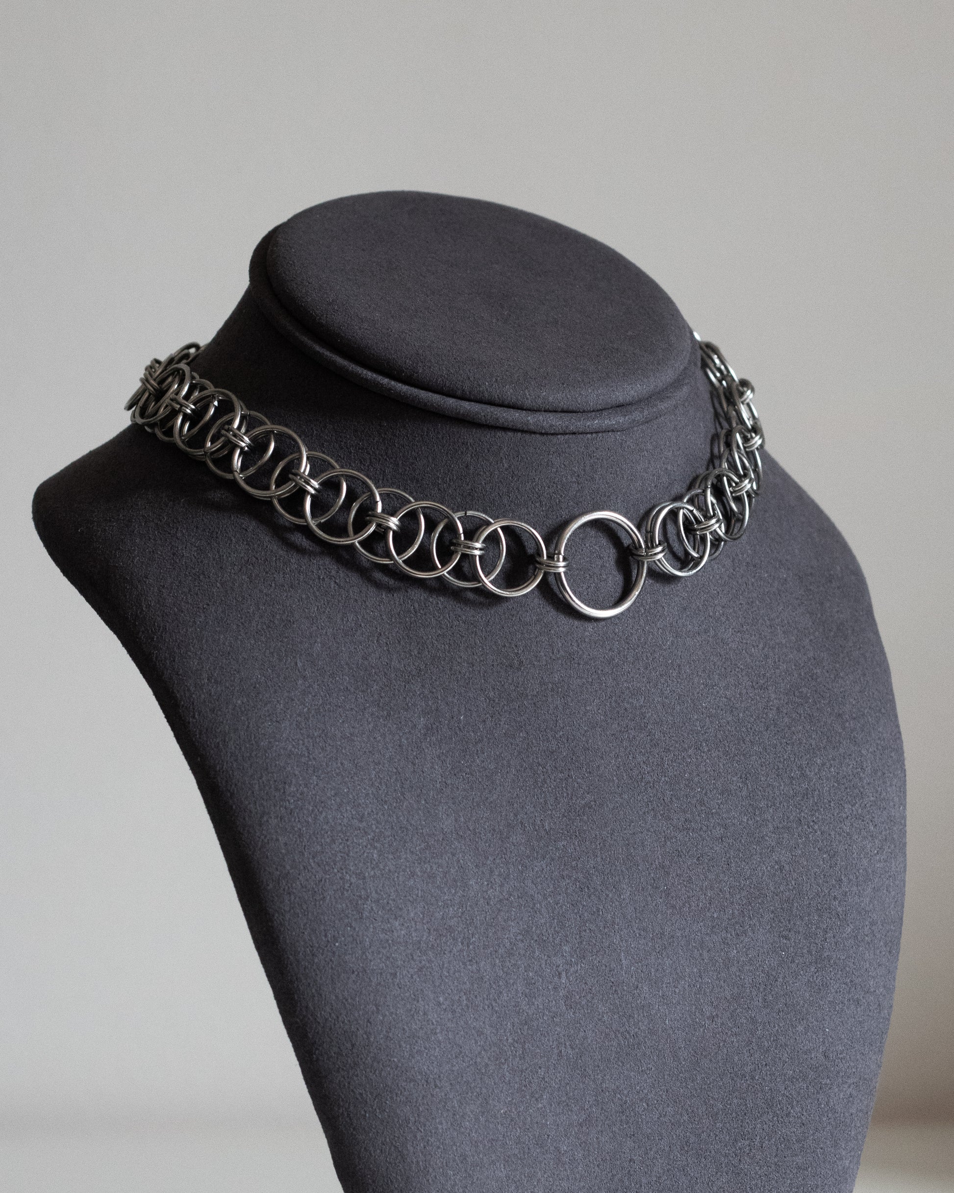 Handcrafted stainless steel choker made with interlocking rings in a balanced and symmetrical chainmail-inspired design. The central larger ring adds structure and focus to the piece, creating a minimalist yet bold statement. Each choker is handmade from high-quality stainless steel, making it durable, hypoallergenic, and resistant to tarnish.